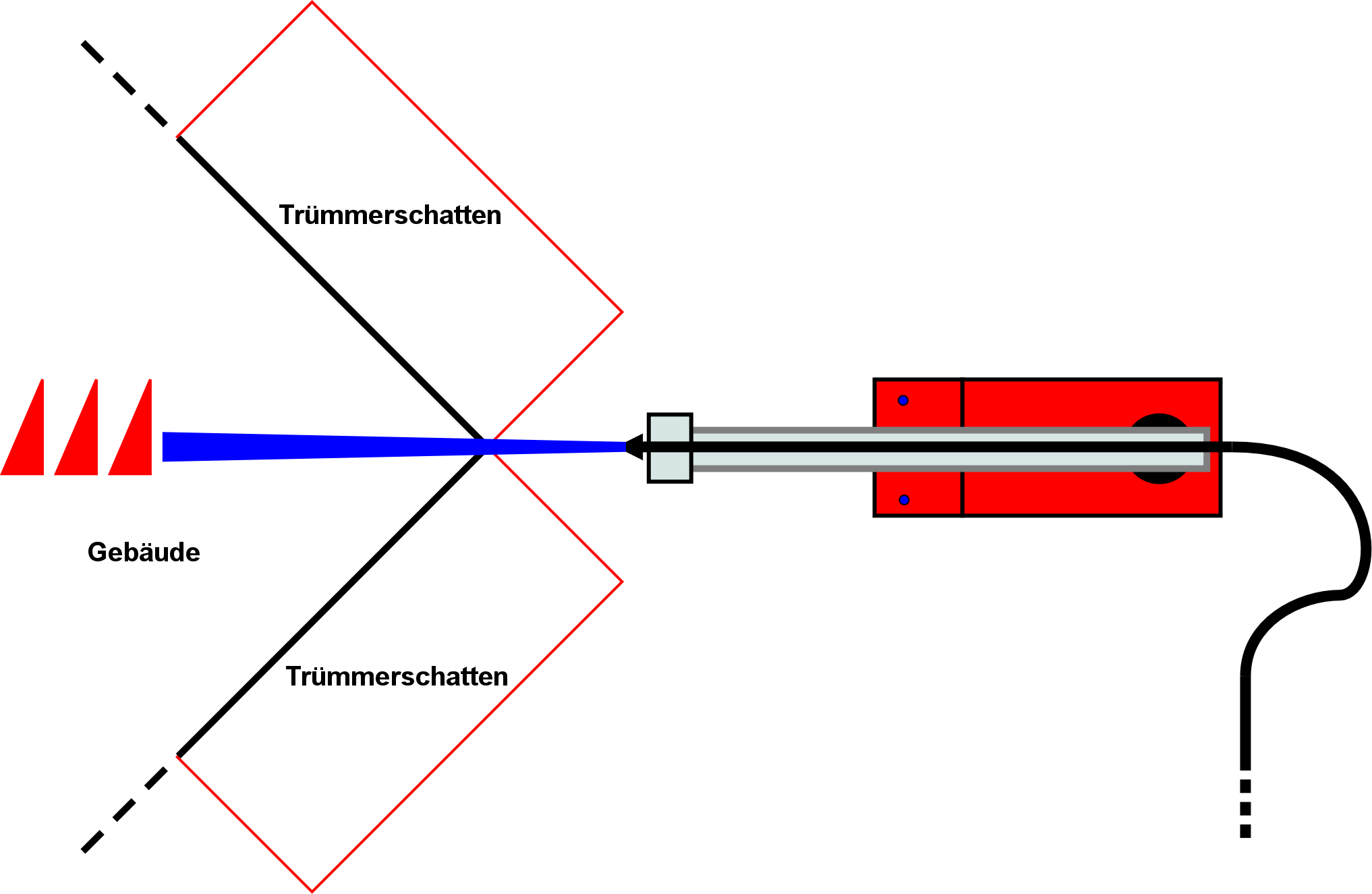 Drehleiter vor den Ecken von Gebäuden aufstellen, da dort der größte Schutz vor nach außen fallenden Wänden gegeben ist (siehe Grafik)