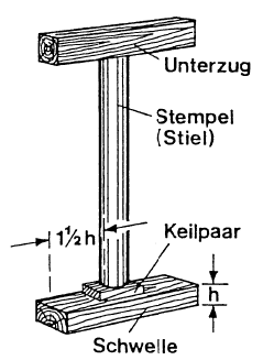 Schwelle und Unterzug müssen beidseitig mindestens 1 ½ Holzstärke über die Stütze hinausragen