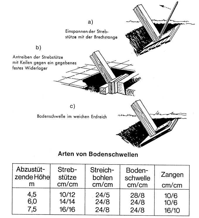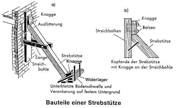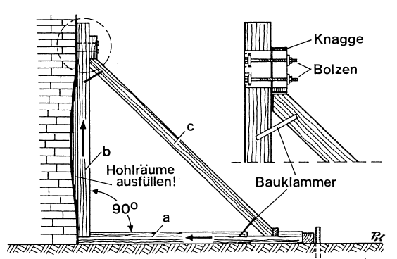 Strebstütze aufrichten und Strebstützenfuß mit mit Brechstange oder Keilen andrücken und mittels Knaggen oder Bauklammern sichern