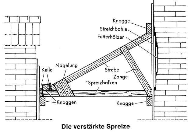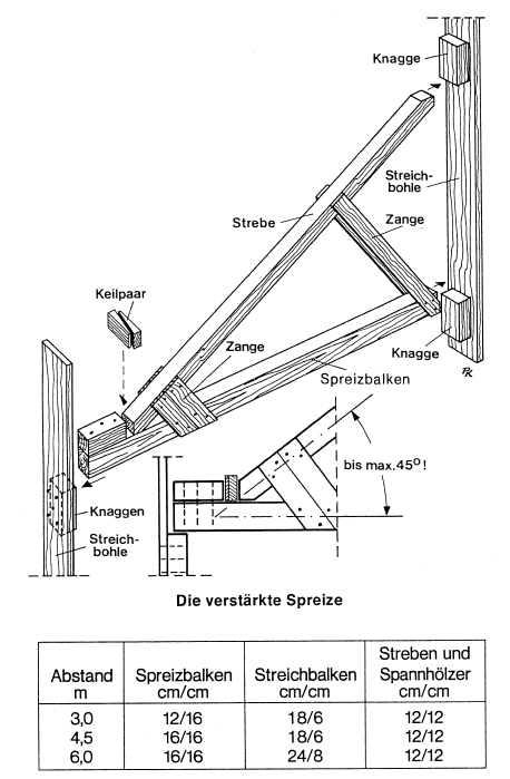 Die verstärkte Spreize dient zur Abstützung bei größeren Stützweiten und zur Aufnahme größerer seitlicher, einseitig auftretender Druckkräfte.