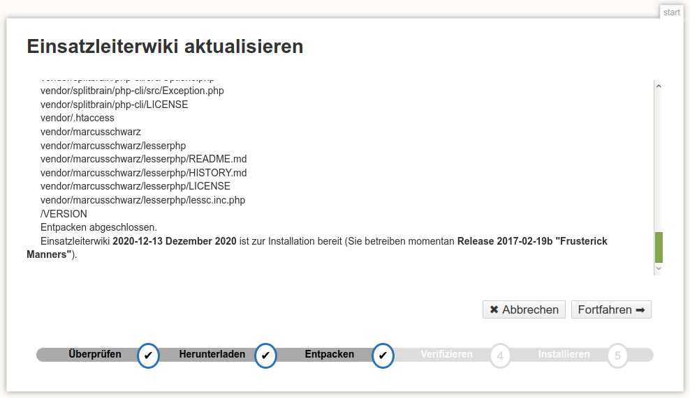 Jetzt wird die aktuelle Version des Einsatzleiterwikis inklusive aller Inhalte installiert. Veraltete Dateien werden automatisch gelöscht. Die Aktualisierung ist damit abgeschlossen. Mit einem Klick auf Fortfahren gelangen Sie zur Startseite. Damit ist die Aktualisierung abgeschlossen.