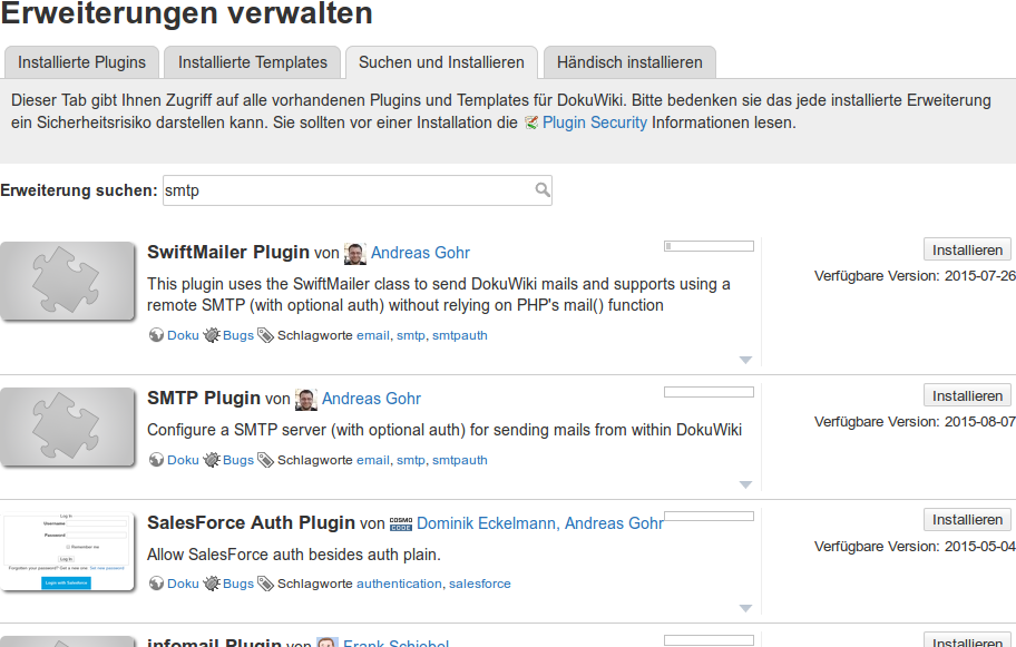 Öffnen Sie auf der Projektseite des DokuWikis die Seite des Plugins, welches Sie installieren möchten. Das SMTP-Plugin finden Sie beispielsweise auf der Seite https://www.dokuwiki.org/plugin:smtp.