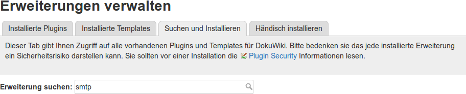 Evtl. möchten oder müssen Sie ein zusätzliches Plugin für Ihr Wiki installieren, welches nicht in der Standardinstallation des Einsatzleiterwikis vorhanden ist. Sie haben verschiedene Möglichkeiten ein solches Plugin zu installieren. Dies wird anhand des SMTP-Plugins demonstriert.